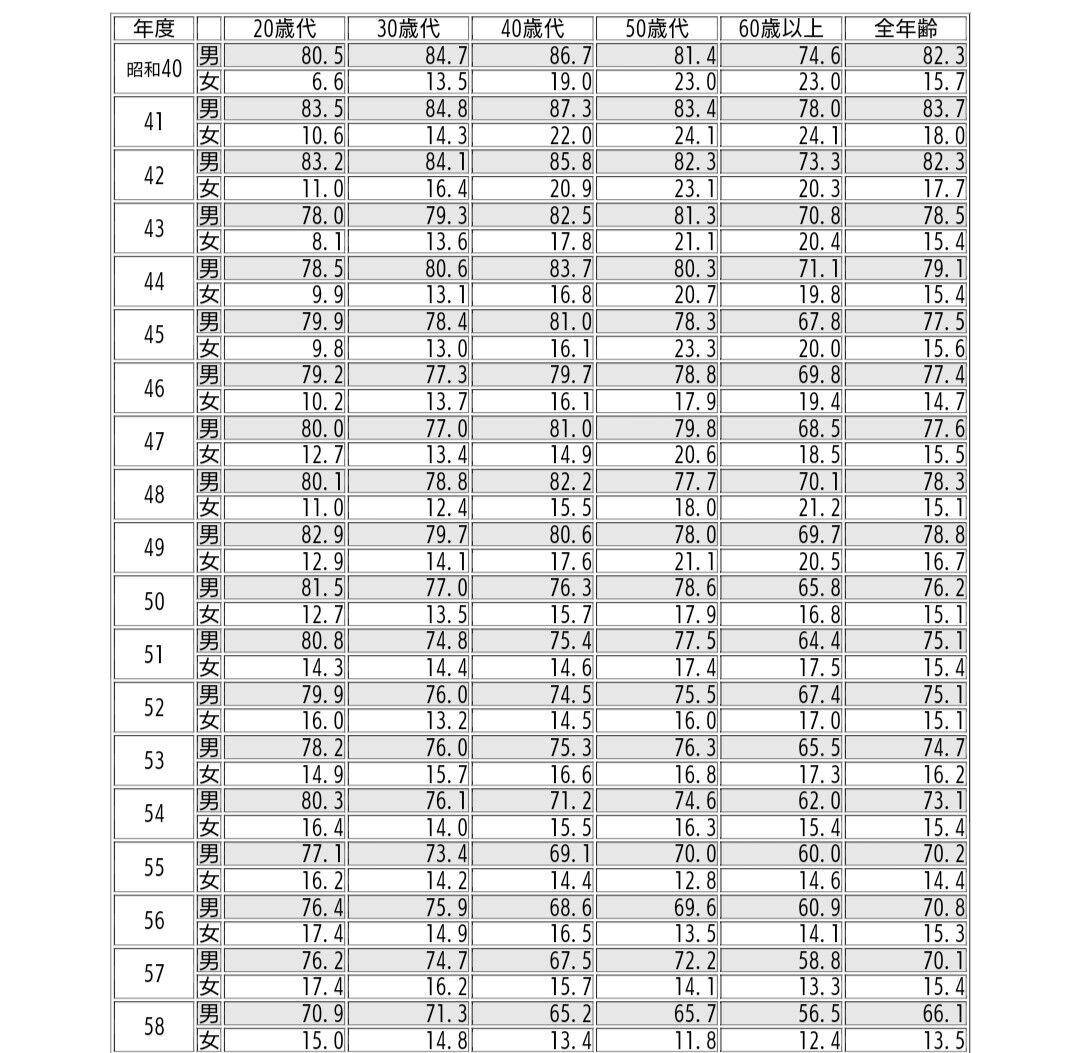 昭和58年だと、20代男性で70.9%、30代男性で71.3%か……